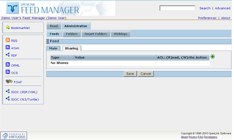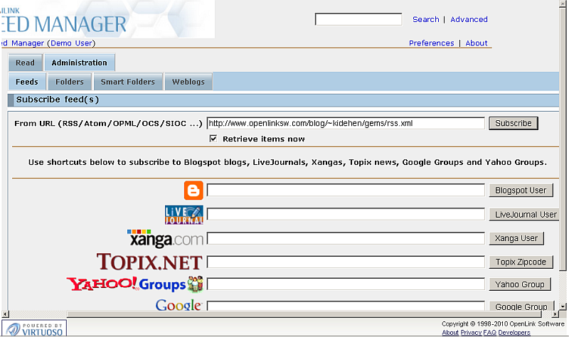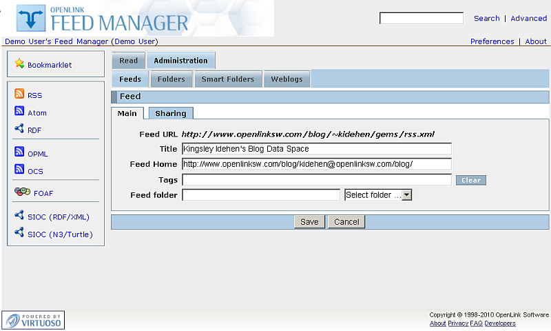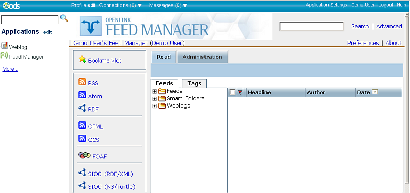 - Logged in as user demo, click the link "Feed Manager" from the left vertical navigation.