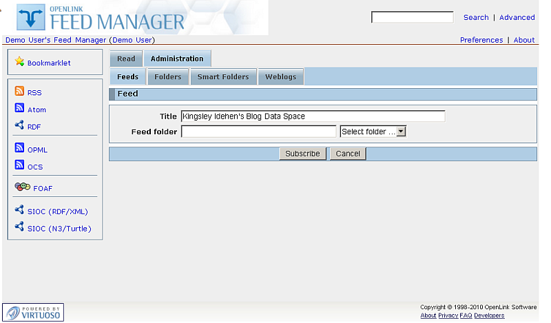 - Suppose a new subscription with name "Kingsley Idehen's Blog Data Space" is created.