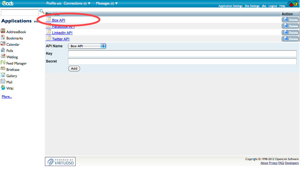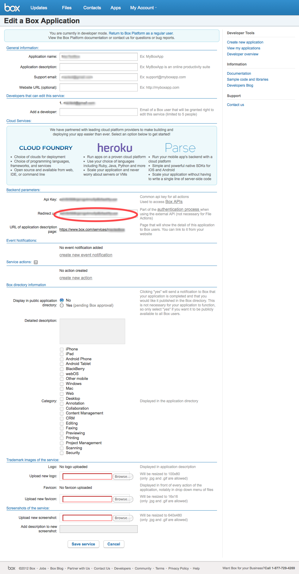 Note that at present, each Virtuoso + ODS instance can only be configured with a single Box API key, which will then be used by all ODS-Briefcase users when targeting Box from that instance. Box may impose limitations on this key's use. Such limitations are outside the scope of- Browse to <https://www.box.com/developers/services/edit/>, and enter your Box user credentials: