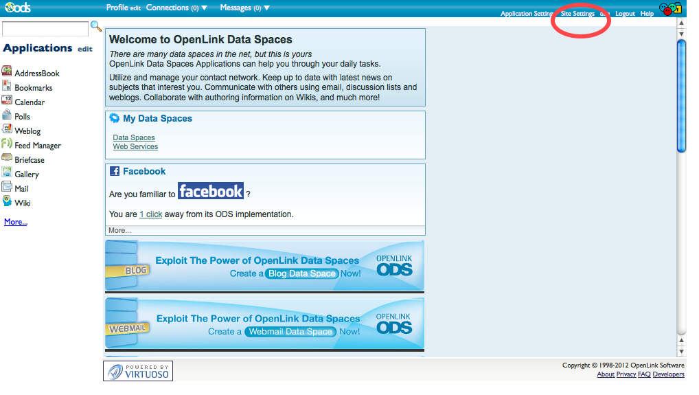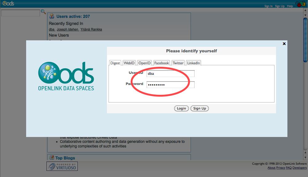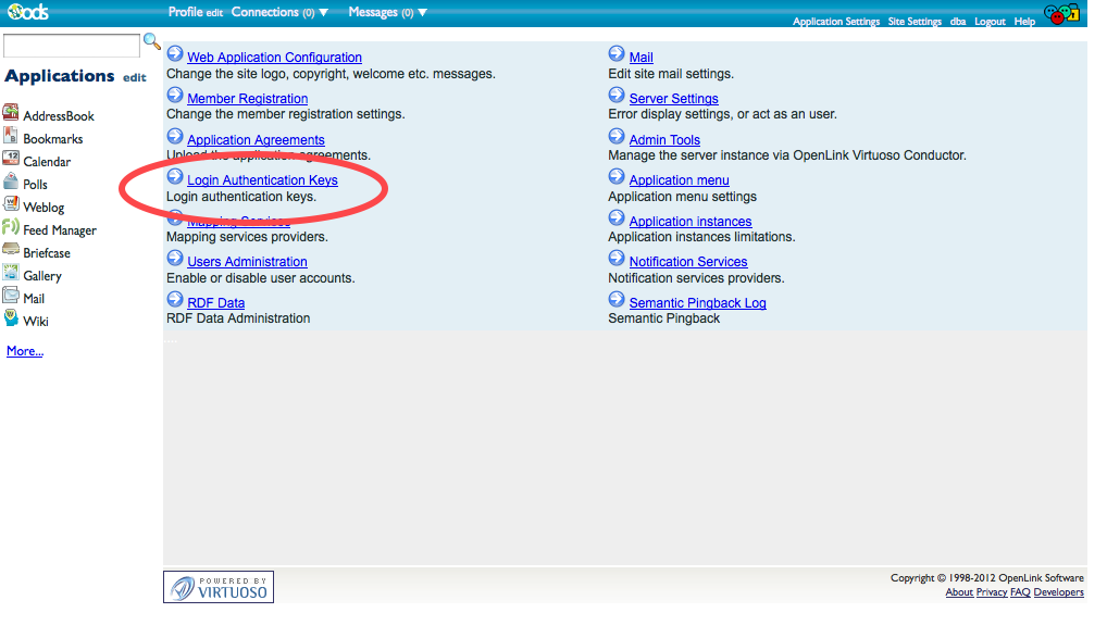 - Log in as a Virtuoso+ODS user with Administrator privileges, e.g.,