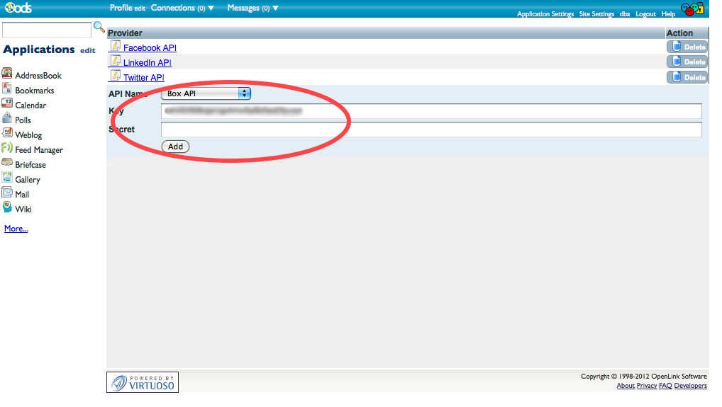 - Select Box API in the API Name menu, provide the Box API Key you got when you registered the application with Box, and click Add.