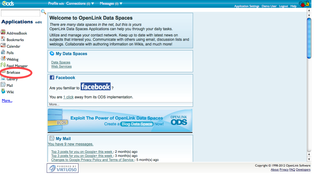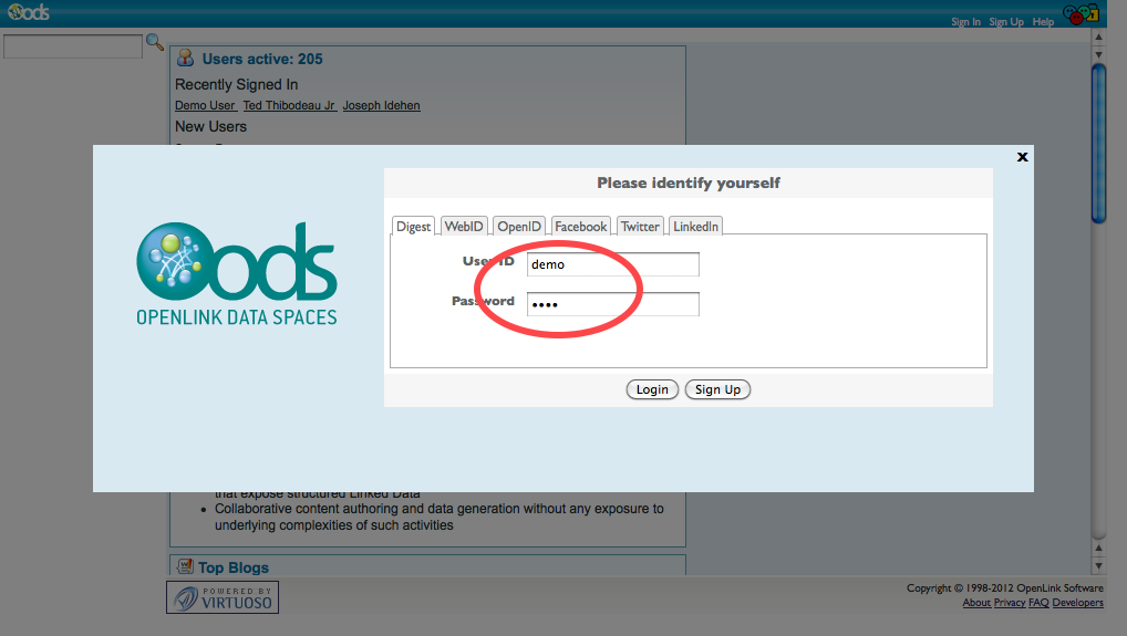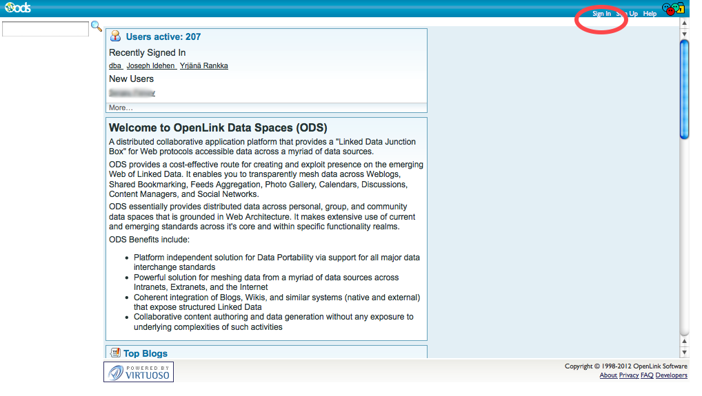 - Log in as a Virtuoso+ODS user with normal privileges, e.g.,