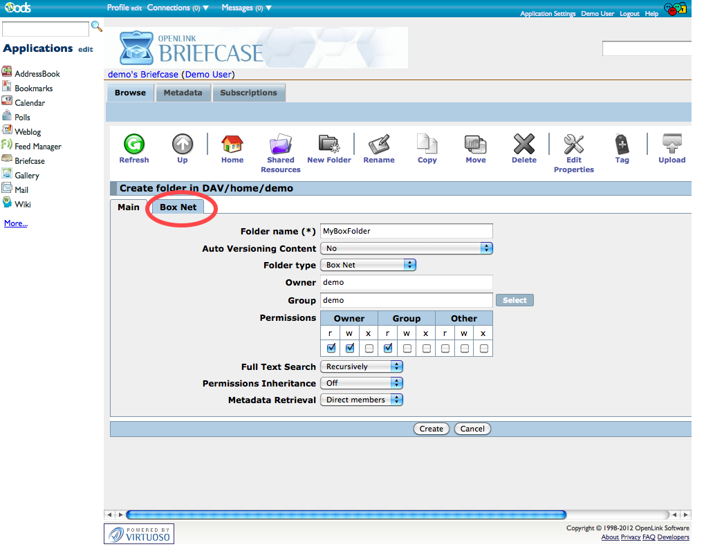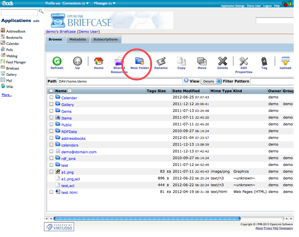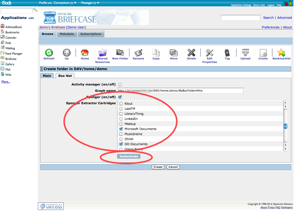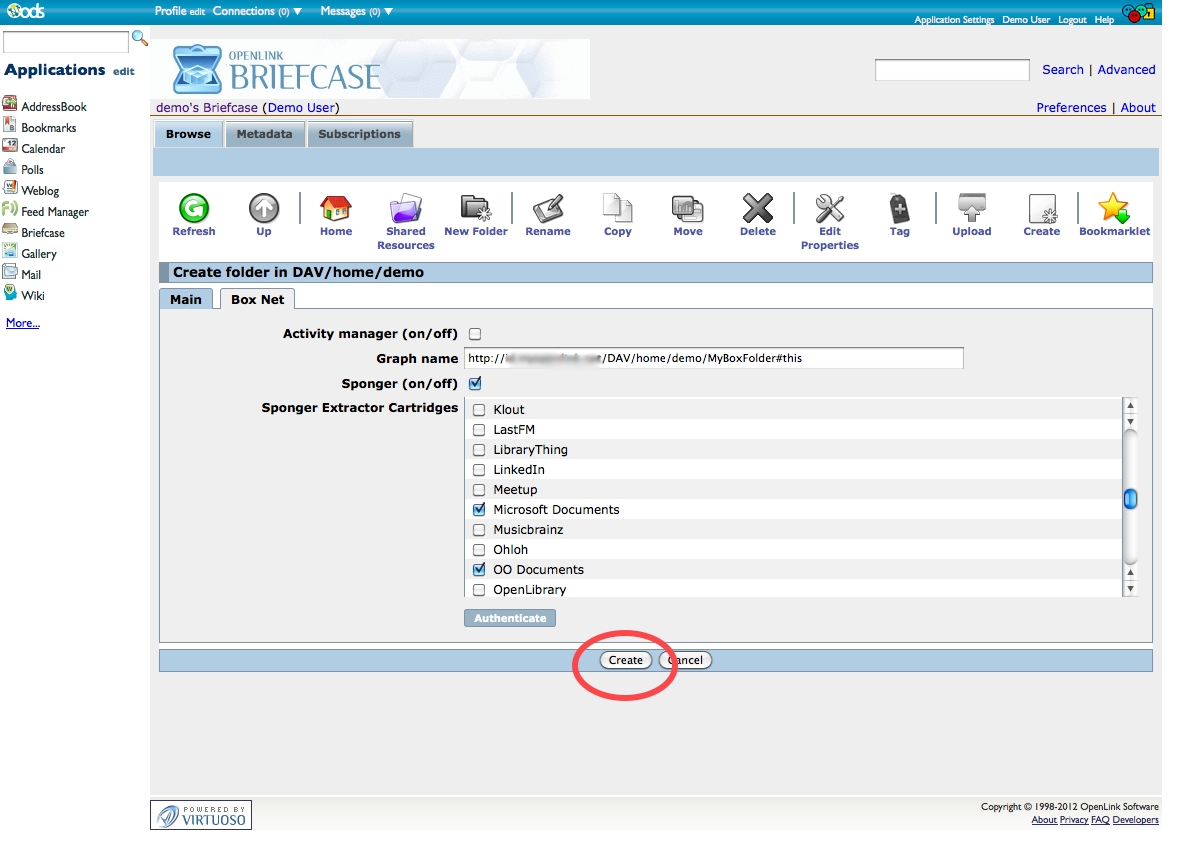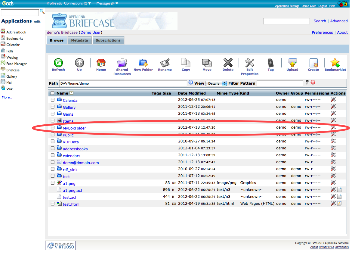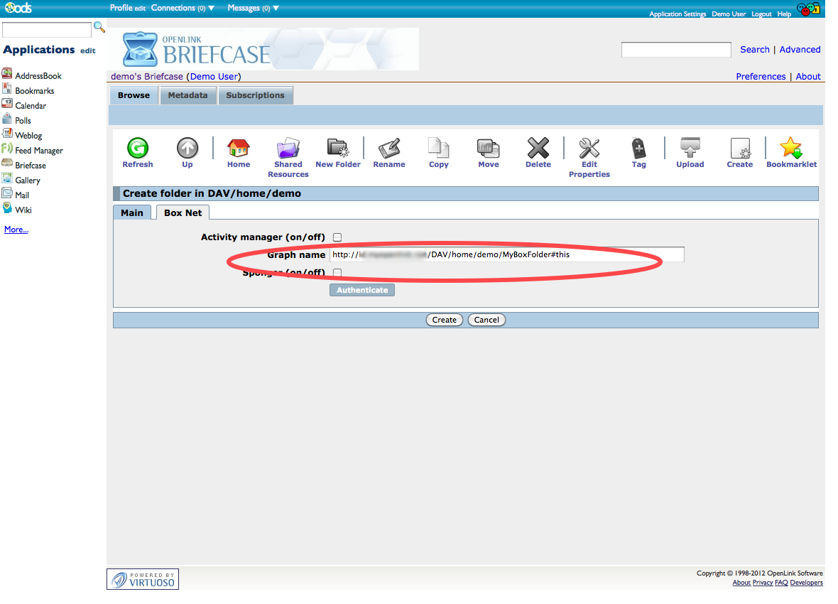 http://<host>[:<port>]/DAV/home/<user-name>/<folder-name>#this-- so, in this example, the default graph would be named <http://example.com/ods/demo/MyBoxFolder#this>. Expert users may wish to change this graph name, but the default is suitable for most users.