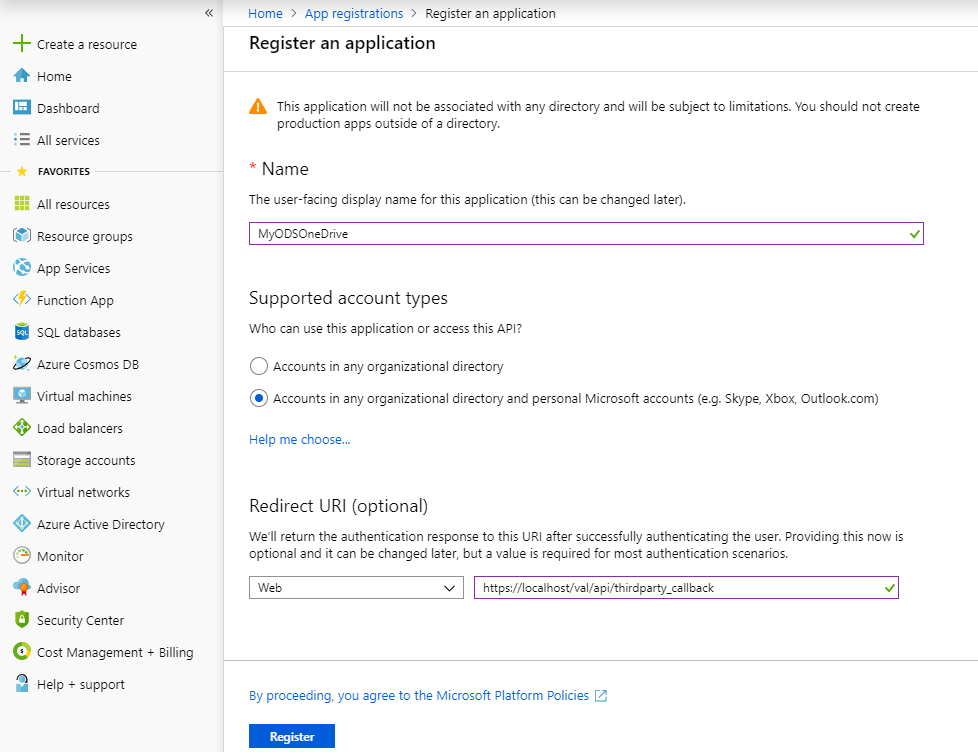 2. Select Azure Active Directory > App Registrations > New Registration and then enter a name for your Live Connect client application (i.e., your ODS-Briefcase instance) to be known by, e.g., "MyODSOneDrive", set the redirect URL, and click the Register button: