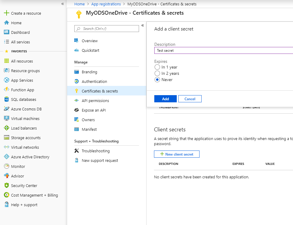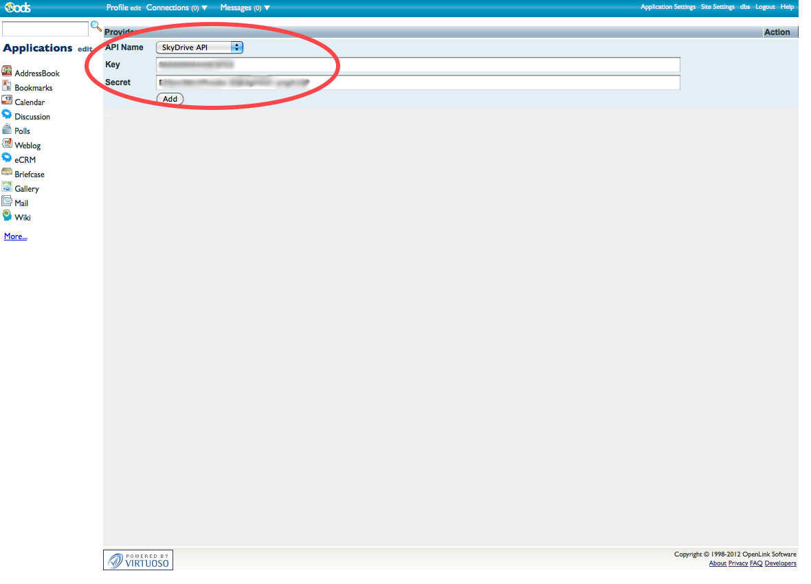 5. Select OneDrive API in the API Name menu, provide the Client ID and Client secret from the new Live Connect application you created above, and click Add.
