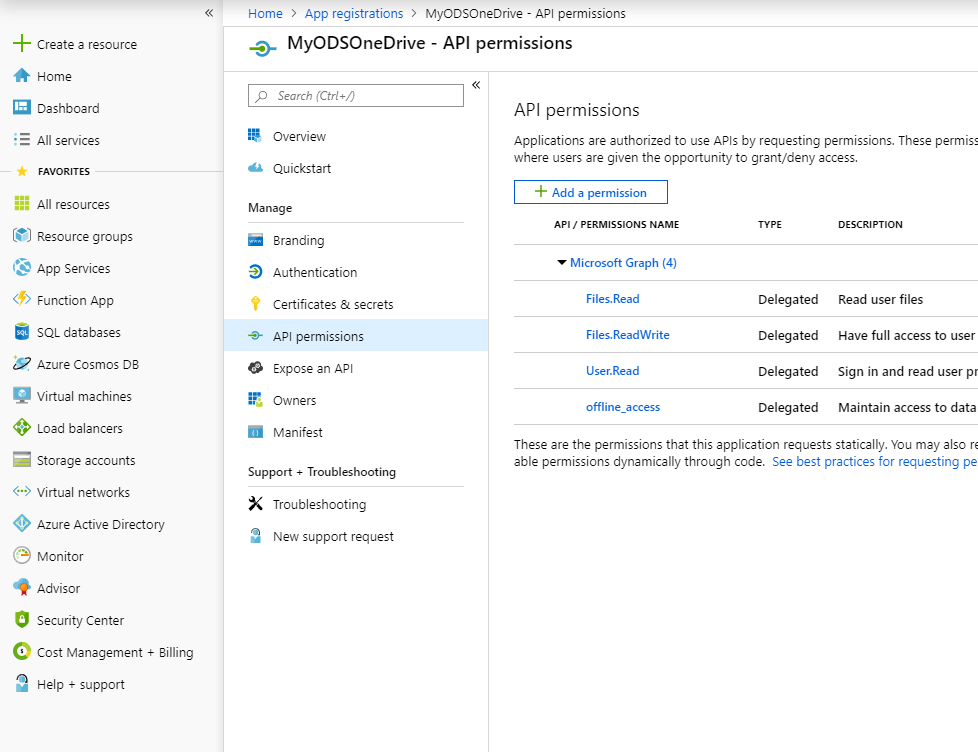 4. Select Api permissions from Application Settings Columb. Use Add permission option to choose needed permissions.