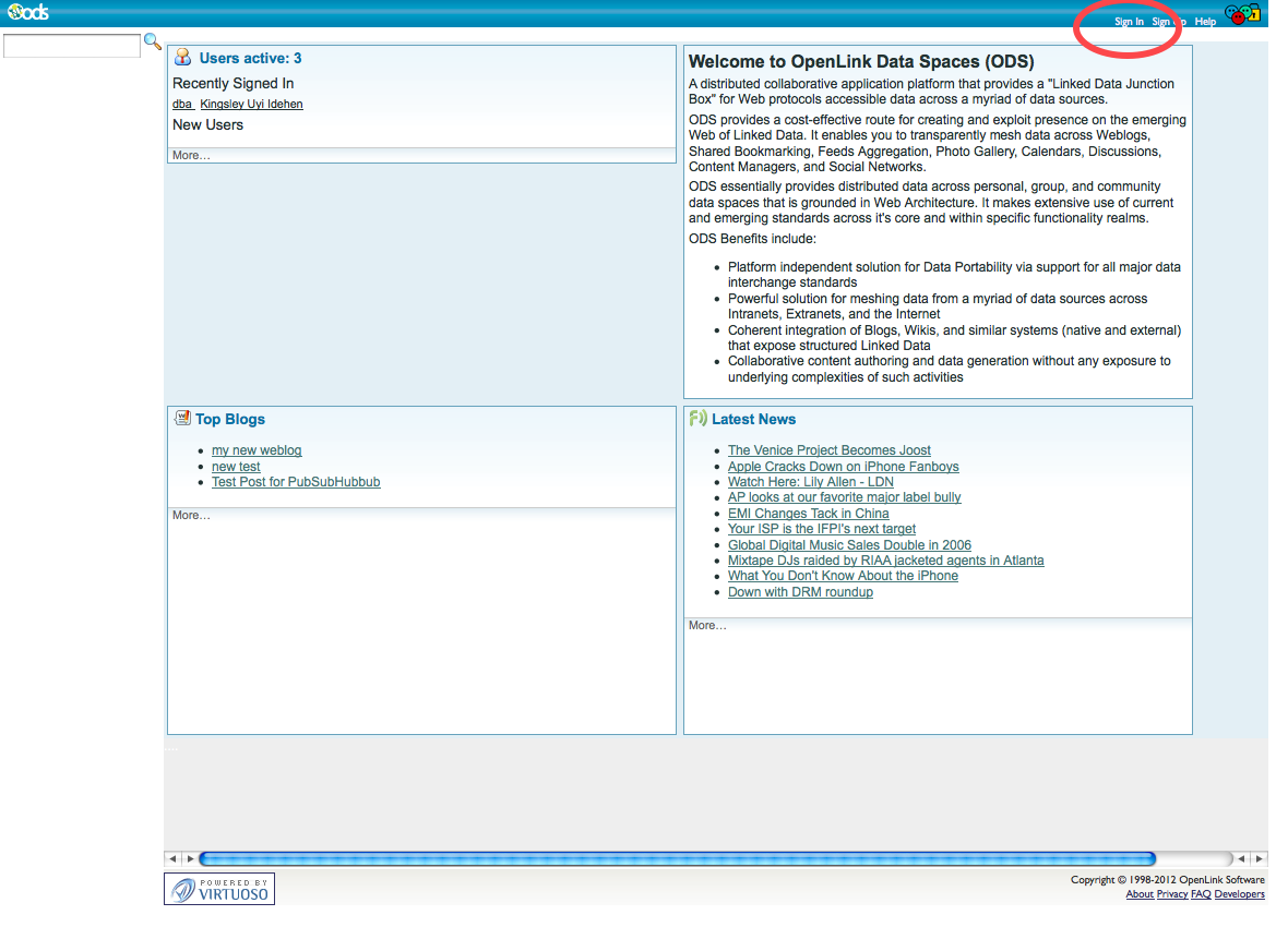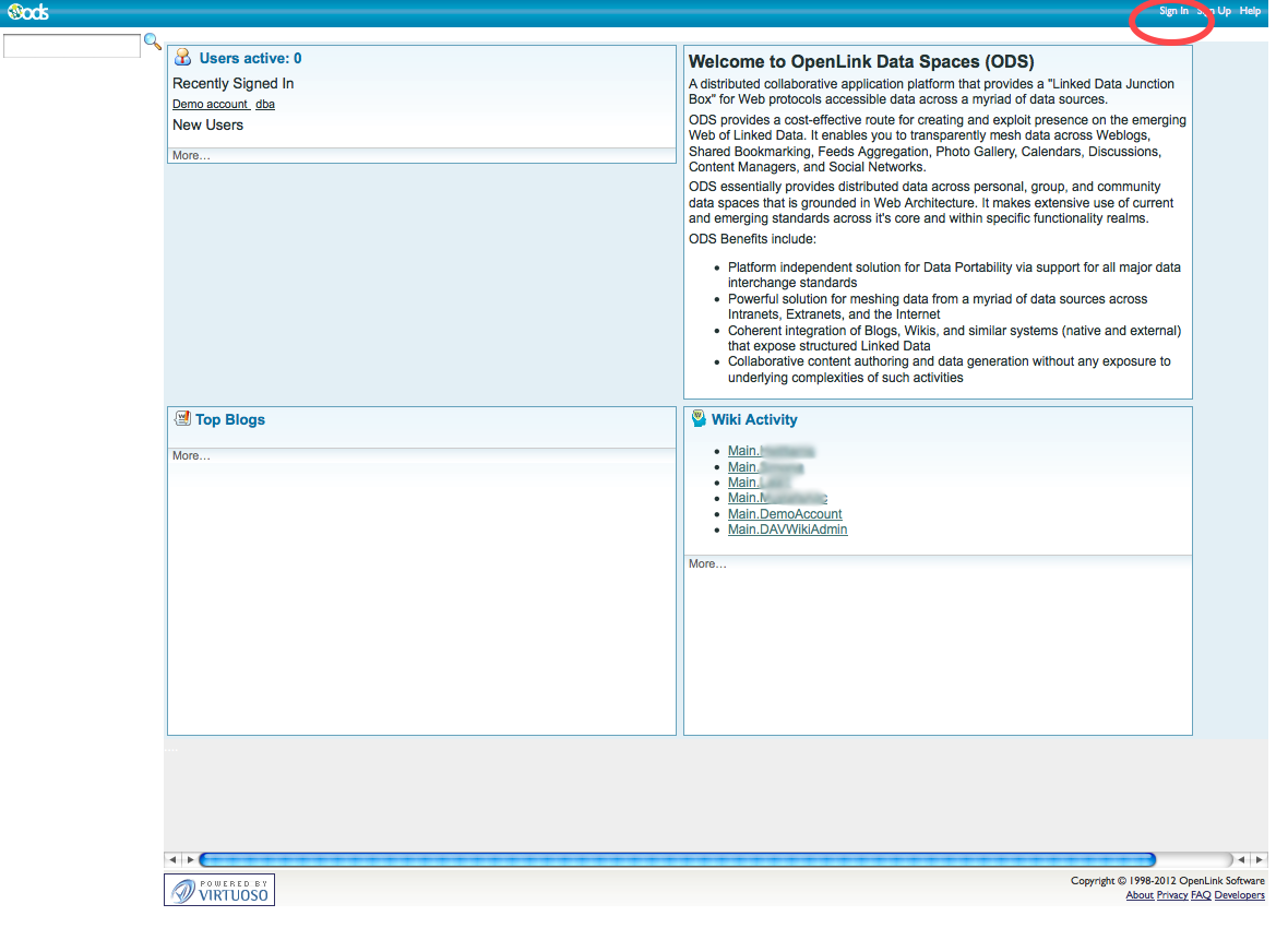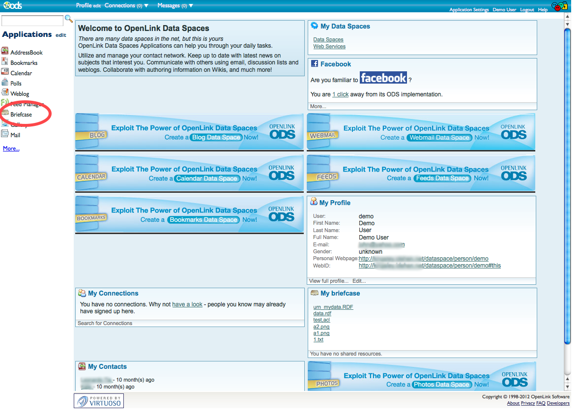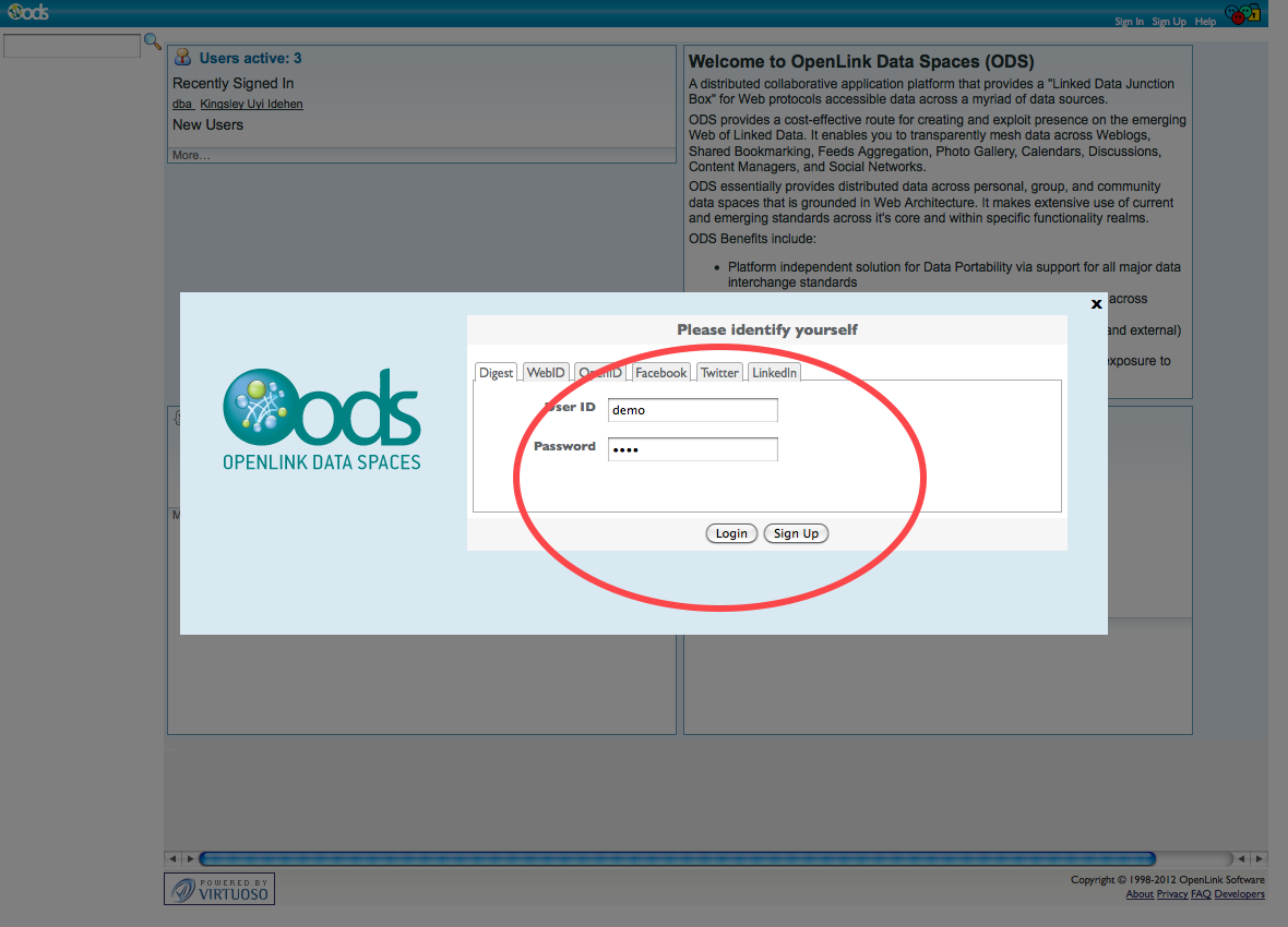 2. Log in as a Virtuoso+ODS user with normal privileges, e.g., demo.