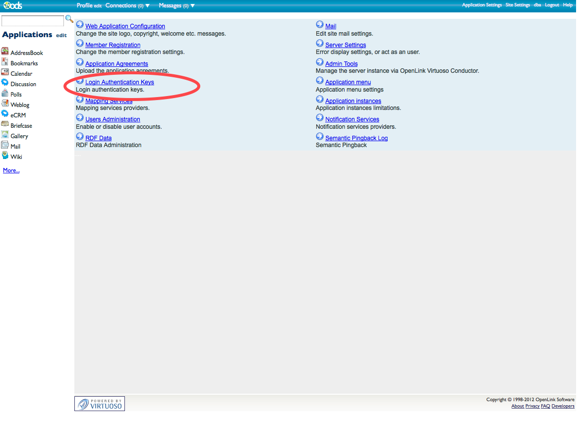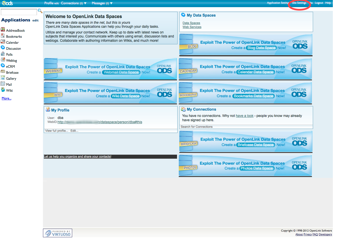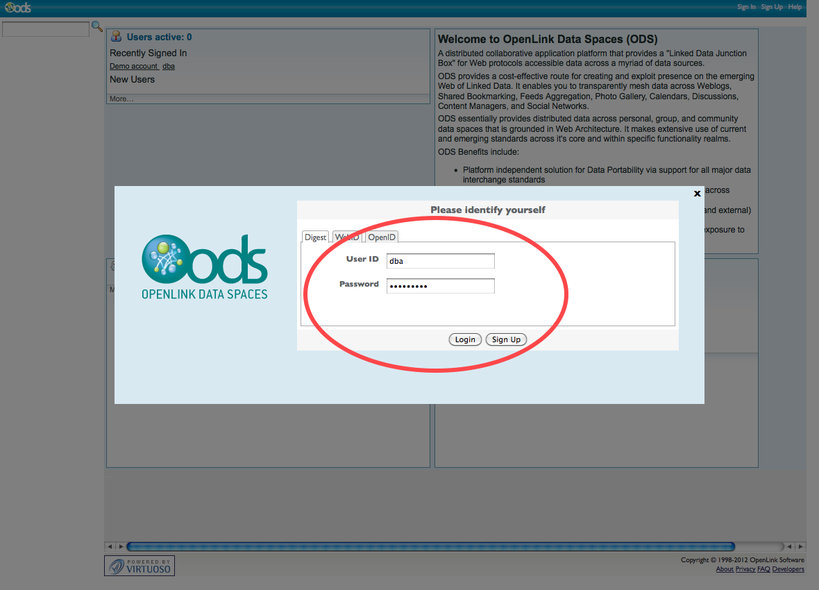 2. Log in as a Virtuoso+ODS user with Administrator privileges, e.g., dba.