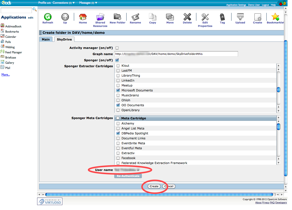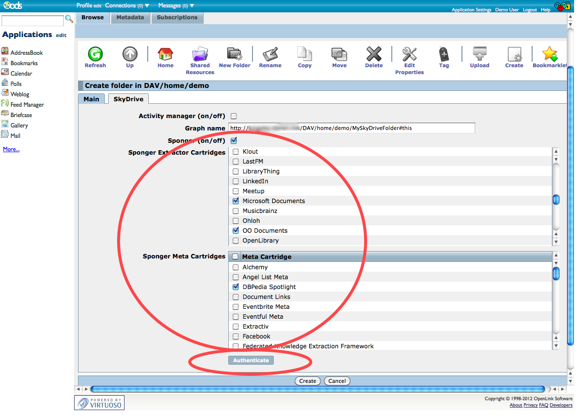 8. You can also turn on the Virtuoso Sponger, to process your OneDrive files more comprehensively. When the Sponger is enabled for your folder, you can specify which "Sponger Extractor Cartridges" and "Sponger Meta Cartridges" will be run over the files in your Google Drive. You can enable all cartridges, but this will introduce some processing overhead. It's generally best to enable only those cartridges which will be applicable to your files and their content. For instance, you may know that you'll only be storing Microsoft and Open Office documents here, and that you want to find all Named Entities described by DBpedia. Then, click "Authenticate", to connect your new folder to your OneDrive: