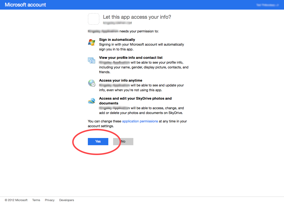 10. Windows Live will prompt for confirmation that you intend to let your application ("MyODSOneDrive") have access to your OneDrive content. Click Yes.